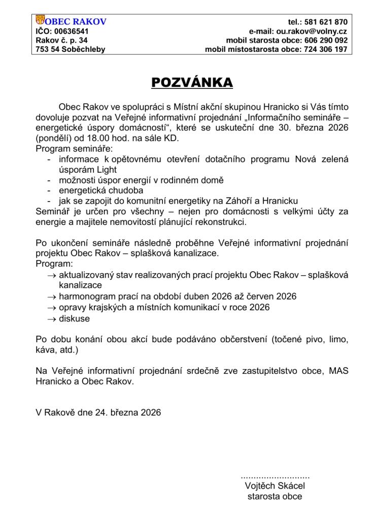 Veřejné informativní projednání Obec Rakov-splašková kanalizace a energetický seminář